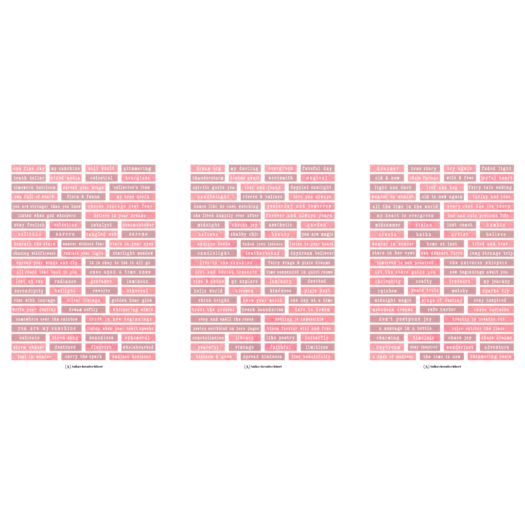 These journaling word strips are designed to inspire reflection, creativity, and intention in your journaling journey. Available in 11 color themes, each set includes 3 unique sheets per color, featuring a variety of empowering and thoughtful phrases. Perfect for journals, junk journals, and planners, these stickers come in matte paper, washi paper, and transparent sticker paper, making them a versatile addition to your creative routine.
