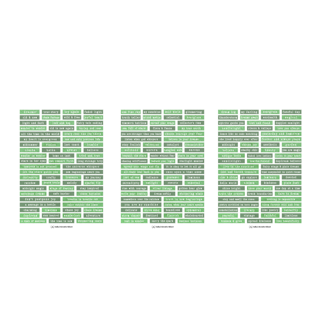 These journaling word strips are designed to inspire reflection, creativity, and intention in your journaling journey. Available in 11 color themes, each set includes 3 unique sheets per color, featuring a variety of empowering and thoughtful phrases. Perfect for journals, junk journals, and planners, these stickers come in matte paper, washi paper, and transparent sticker paper, making them a versatile addition to your creative routine.
